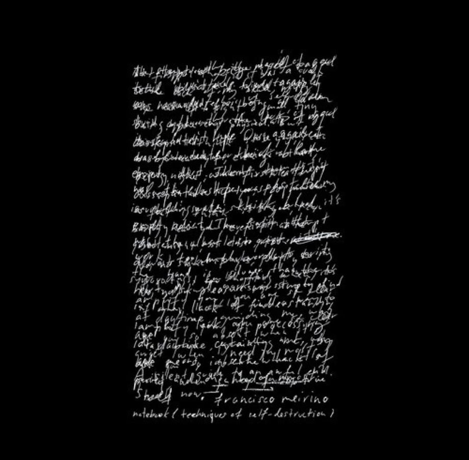 Over the past five years (or so), the work of Francisco Meirino has moved ever forward by leaps and bounds. Once the man discovered what could be done with an EMF detector, his aesthetic world exploded from that of a guttural noise-monger to that of an exemplary composer of muscular electro-acoustics. In sonorizing the signals from his EMF detector, Meirino gives voice to the electrical field in any given space. Parapsychologists and ghost hunters have used these devices as citations pointing to their claims of hauntings, poltergeist activity, and residual energies from psychic distress. Not surprisingly, Meirino did engage in the realm of the paranormal by working with ghost hunter Michael Esposito on an album mapped out of EVP recordings sourced by Meirino and researched by Esposito. Audio bleedthrough, spikes of energy, crude stabs of noise, electrified drone, and disruptions of all kind are commonplace within the sonic markmaking for Meirino; and Notebook (Techniques Of Self-Destruction) stands as one of the finest albums in Meirino's catalogue. Aggressive cuts across tape and digital files reveal jagged edges between frequencies and sonorities that Meirno exaggerates and telescopes as if all of his sounds were atomic particles irradiated with x-rays and then smashed against the clinical floor of some Swiss laboratory left to wiggle, glow, and collapse without much concern from the technician doing the smashing. There is a violence to Meirino's work, and it's one that carries over from his youthful days working under the noise moniker Phroq. The violence is actually more impactful given the dynamics of Meirino's techniques and compositional artistry. It's obvious that he's been pursuing a parallel path as that of the Schimpfluch Gruppe (e.g. Rudolf Eb.Er, G*Park, Dave Phillips, and Sudden Infant); and Notebook is a worthy contender to follow in that lineage of transgressive actions and theatrical nihilism.