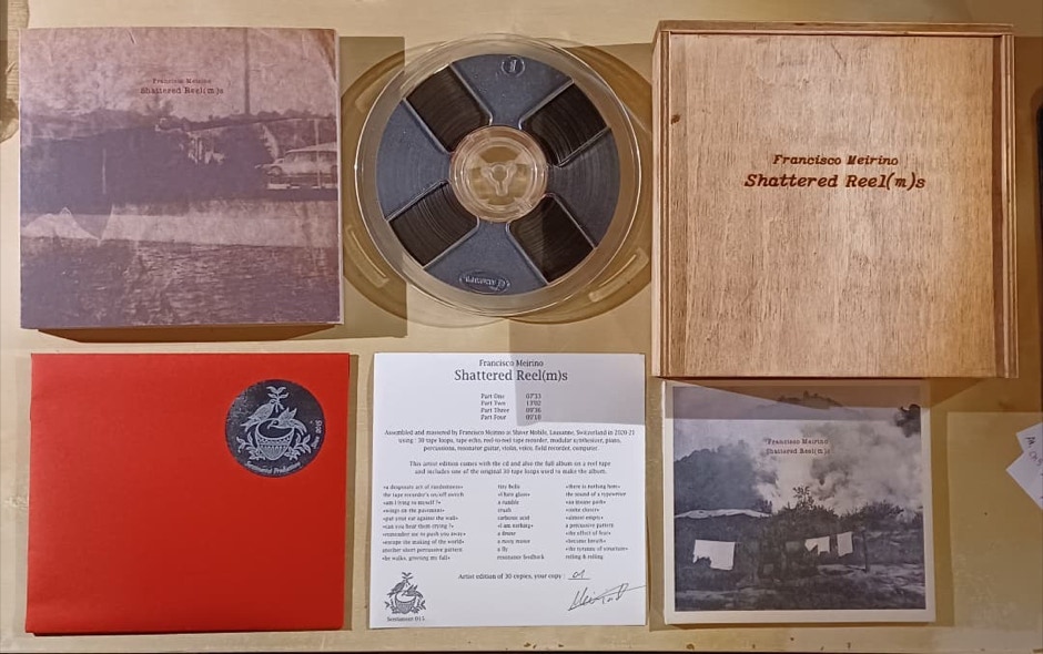 The new release by Switzerland's Francisco Meirino comes in two editions. One is a standard CD, and the other is the CD housed in a wooden box, plus the album on a reel-to-reel machine, plus one of the thirty tape-loops in the production of the music. I got one of those; maybe my recent love for old reel machines didn't go unnoticed? Next to the thirty loops, Meirino uses a lot more, a list of which reads like poetry; a tiny bell, a rumble crus carbonic acid, a drone, a rusty motor etc. There is also a less poetic list, "30 tape loops, tape echo, reel-to-reel tape recorder, modular synthesizer, piano, percussions, resonator guitar, violin, voice, field recorder and computer.