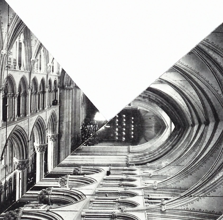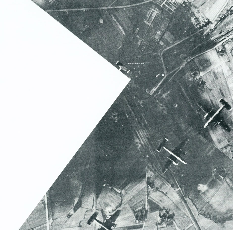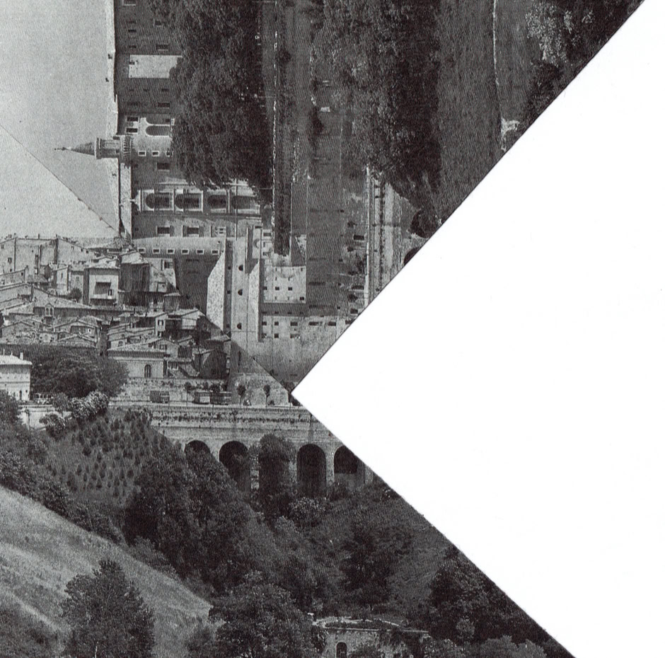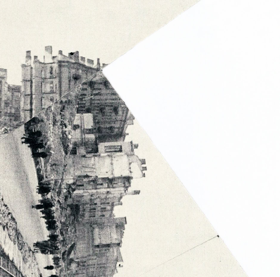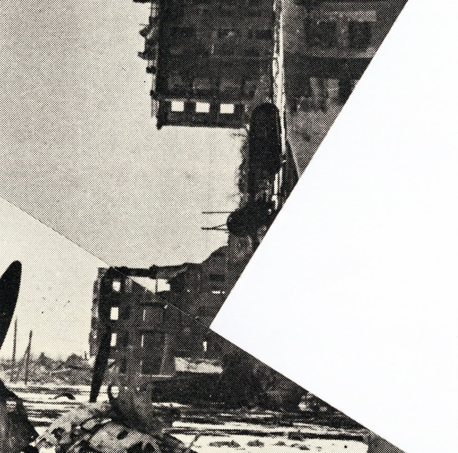 every collage is made of one cut : a straight line between corners, and a 90 degree movement. An attempt at shape a new reality out of historical, war and architecture photo archives.